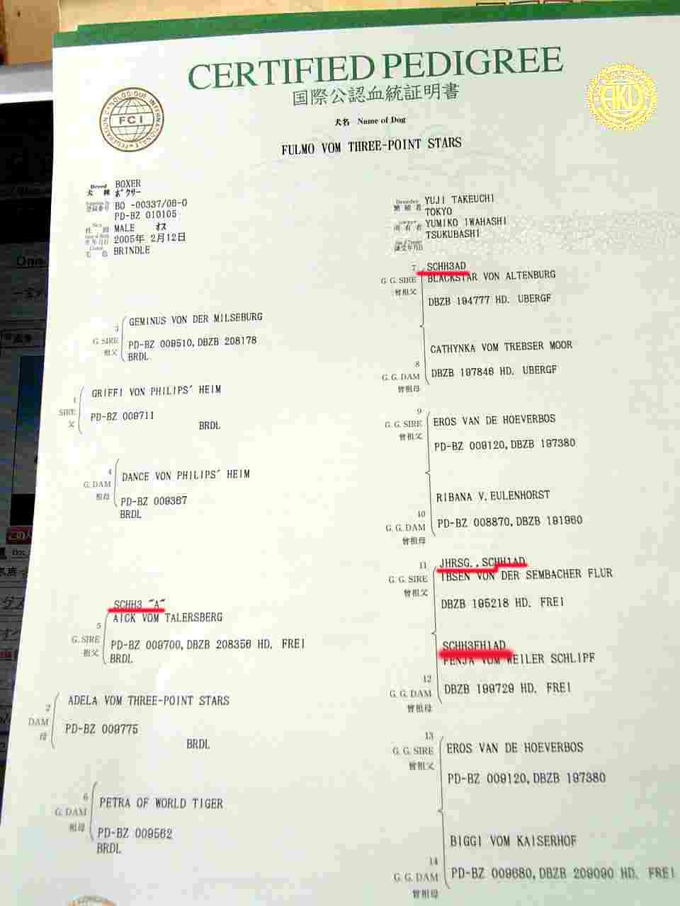 今までボクサーの訓練犬の中で一番といわれるアイクはフォルテのおじいちゃんで、その両親もSCHH3の資格持ち。つまり、おじいちゃんまでが外産なわけだ。