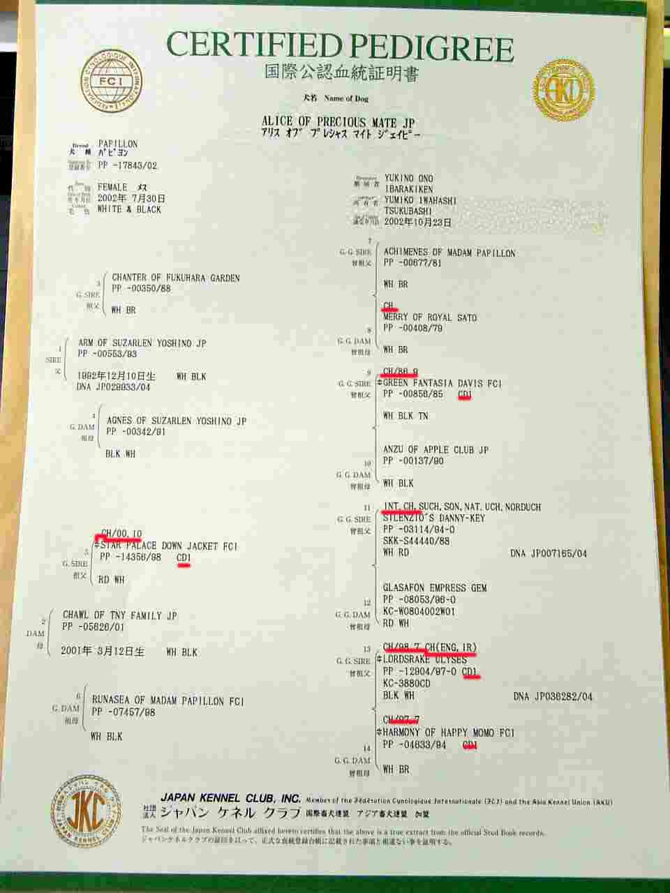 JKCは国際的なチャンピオンとか訓練資格とかしか認めていないので、JKCの血統書はPDと少し違って、NcHとかPBHとかの栄誉や資格は全く記載されない。